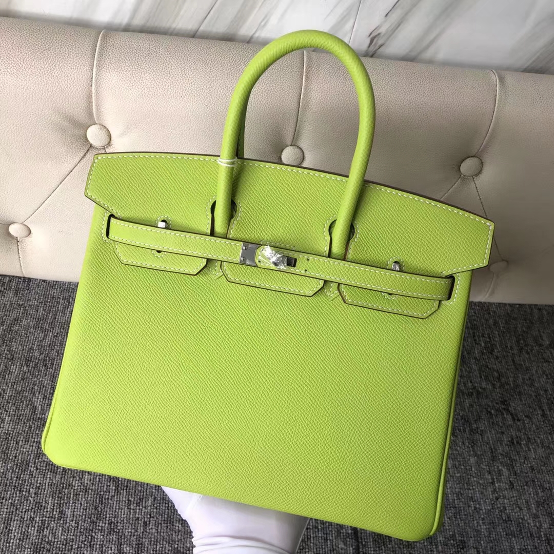 Brand: Hermes; Style: Birkin Bag; Material:Epsom Calf Leather;Color:9R Apple Green; Size:25cm; Hardware:Silver;Package:Complete Package;Function:Tote Bag.