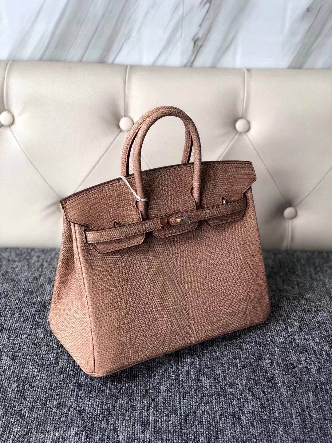Brand: Hermes; Style: Birkin Bag; Material:Shiny Lizard Leather;Color:Apricot; Size:25cm; Hardware:Gold;Package:Complete Package;Function:Tote Bag.