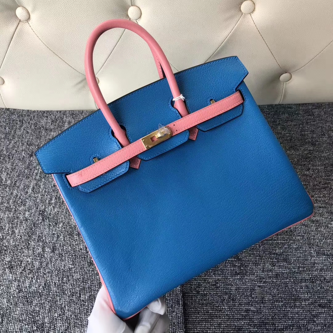 Brand: Hermes; Style: Birkin Bag; Material:Chevre Leather;Color:7Q Blue Mykonos/Rose Lipstick; Size:25cm; Hardware:Gold;Package:Complete Package;Function:Tote Bag.