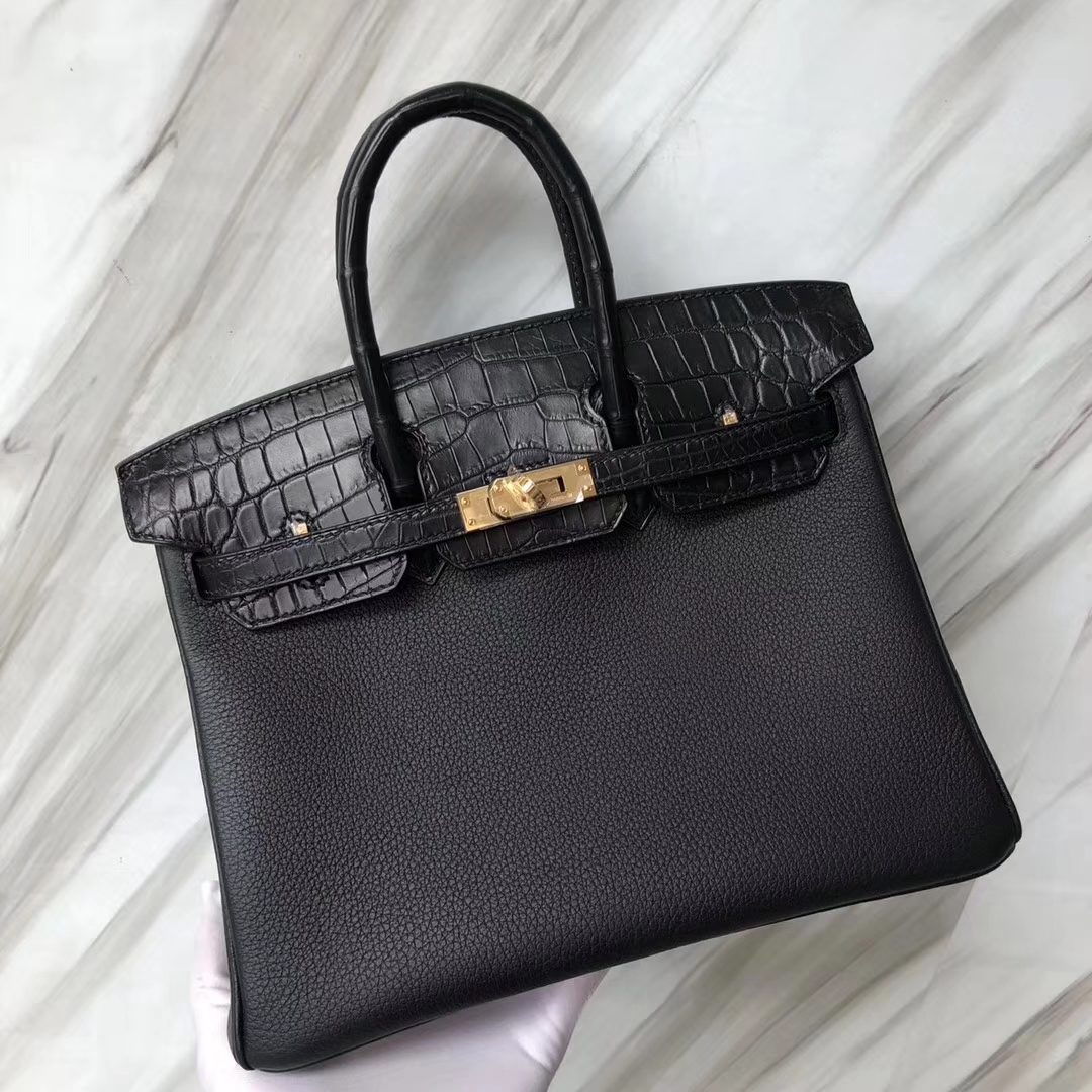Brand: Hermes; Style: Birkin Bag; Material:Alligator Matt Crocodile/Togo Calf Leather;Color:CK89 Noir; Size:25cm; Hardware:Gold;Package:Complete Package;Function:Tote Bag.