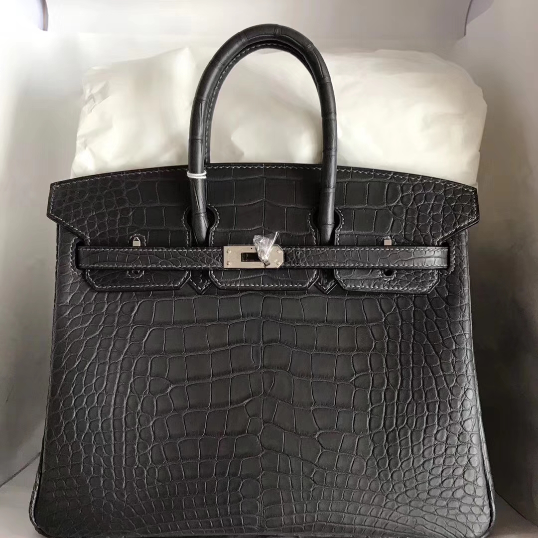 Brand: Hermes; Style: Birkin Bag; Material:Alligator Matt Crocodile Leather;Color:88 Graphite Grey; Size:25cm; Hardware: Silver; Accessories: Padlock and Keys, Dust Bag.Function:Tote Bag.