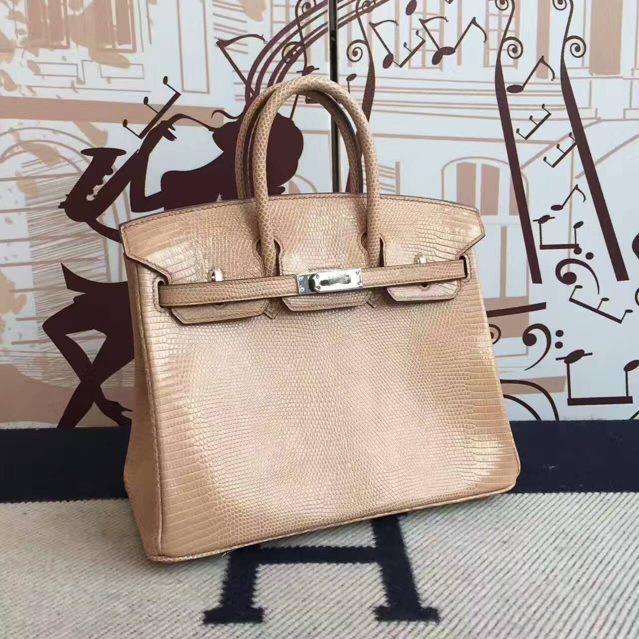 Brand: Hermes; Style: Birkin Bag 25cm; Material: Lizard Skin Leather;Color: apricot ; Hardware: silver/gold; Accessories: Padlock and keys,dust bag.Function:tote bag.