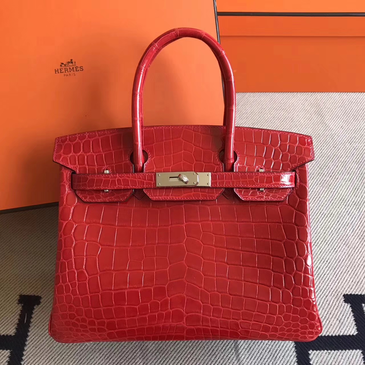 Brand: Hermes; Style: Birkin Bag; Material: Crocodile Shiny Leather;Color: Q5 Rouge Casaque;Size:30cm; Hardware:Silver; Accessories: Padlock and keys,dust bag.Function:tote bag.