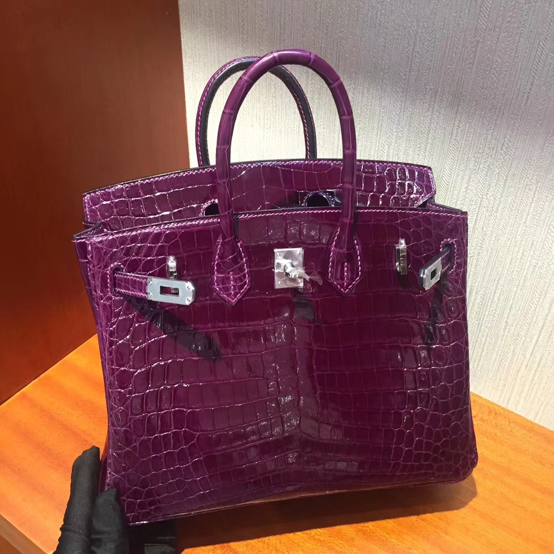 Brand: Hermes; Style: Birkin Bag; Material: Shiny Crocodile Leather;Color: Grape Purple; Size:25cm; Hardware: Silver;Accessories: Padlock fand Keys, Dust Bag.Function:Tote Bag.
