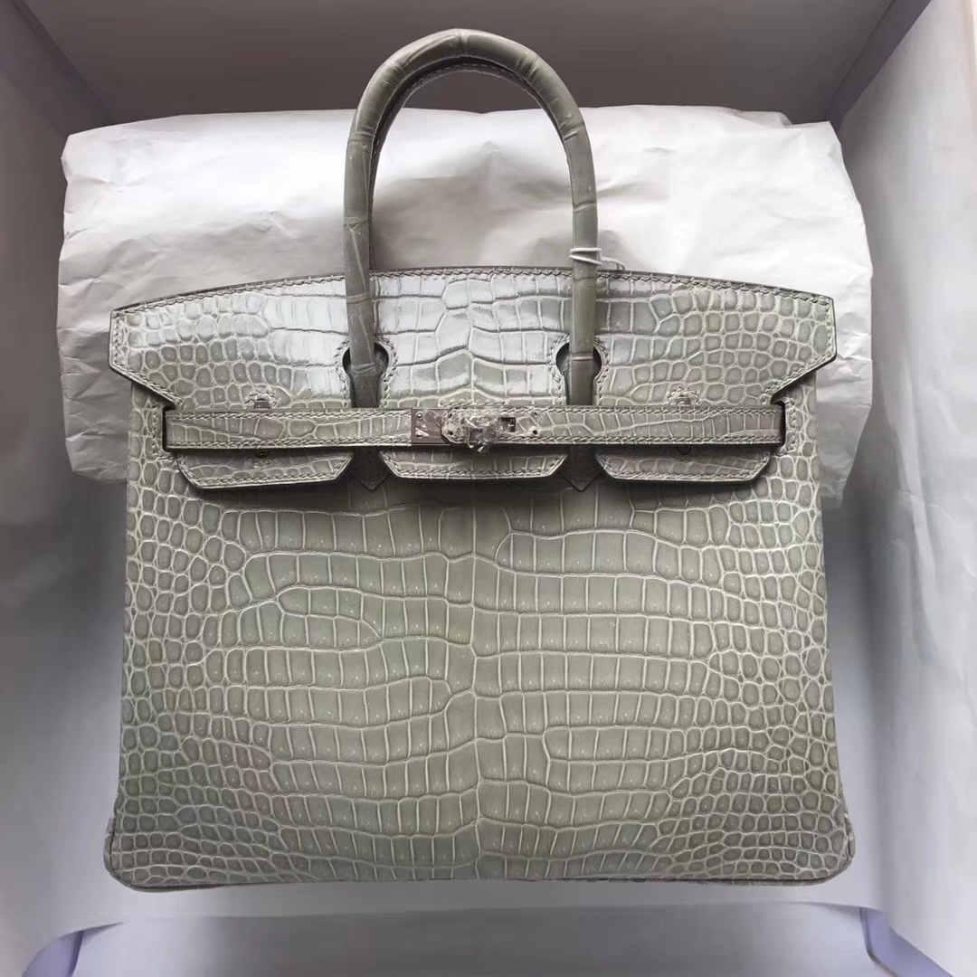 Hermes Pearl Grey Porosus Shiny Crocodile Birkin 25CM Tote Bag