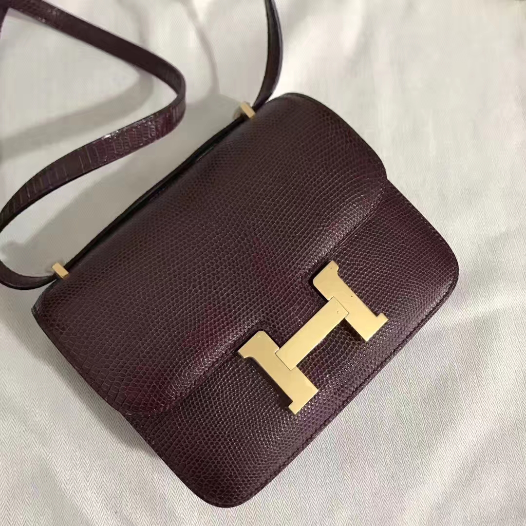 Brand: Hermes; Style: Constance Bag; Material: Lizard Leather;Color: CK57 Bordeaux; Size:18cm; Hardware: Gold; Package:Complete Package.Function:Shoulder Bag,Cross Body Bag.