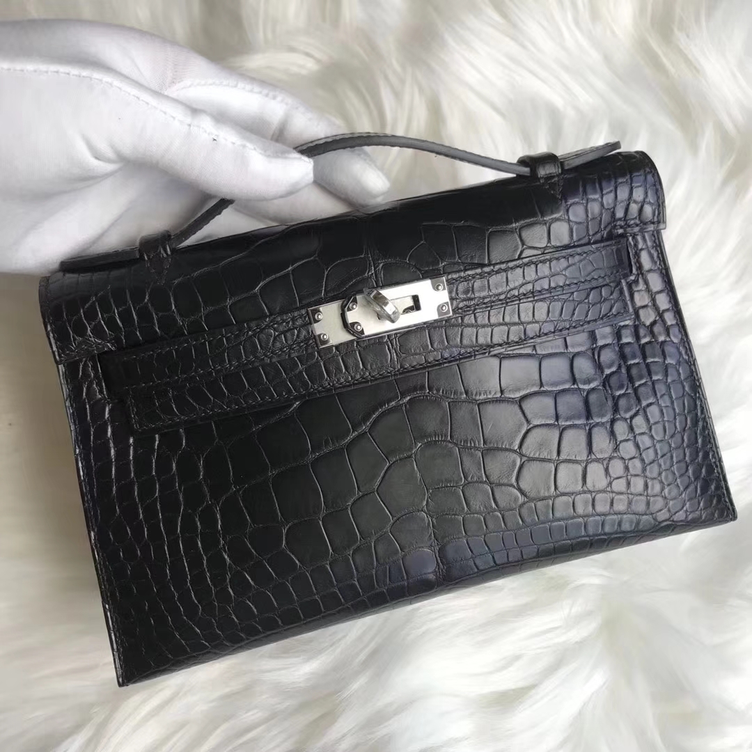 Brand: Hermes; Style: Minikelly Pochette 22CM ; Material:Alligator Matt Crocodile Leather;Color:CK89 Black; Hardware:Silver; Accessories: Padlock and Keys, Dust Bag.Functions: Tote Bag, Clutch Bag,Evening Bag.