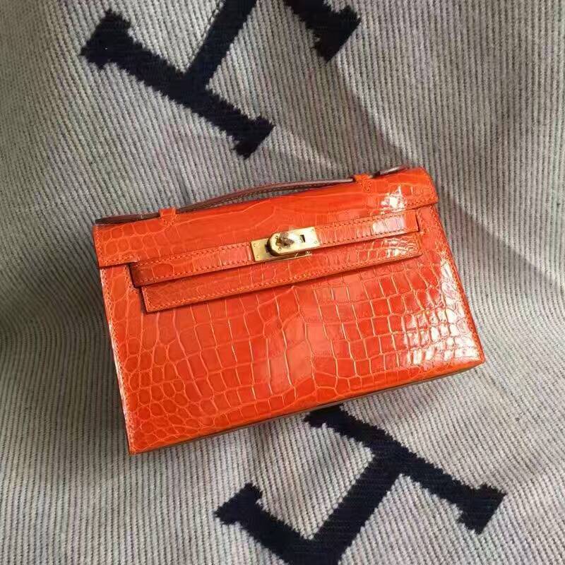 Hermes Orange Crocodile Shiny Leather Minikelly Clutch Bag 22CM