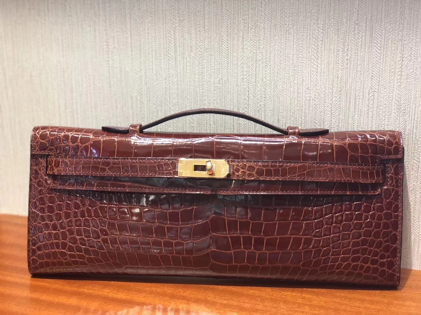 Hermes Porosus Shiny Crocodile Kelly Cut Clutch in CK 31 Miel Brown