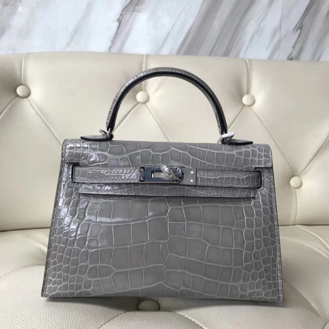 Brand: Hermes; Style: Minikelly-2 ; Material: Alligator Shiny Crocodile Leather;Color:Gris Paris; Hardware: Silver; Size:19CM; Accessories: Padlock and keys, dust bag.Functions: Tote Bag, Clutch Bag,Evening Bag