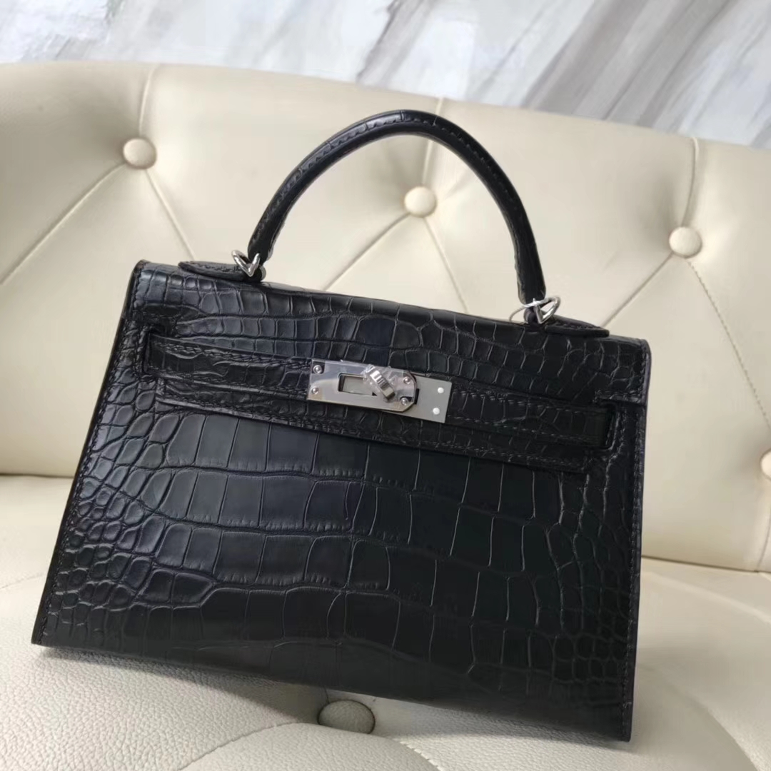 Brand: Hermes; Style: Minikelly-2 ; Material: Alligator Matt Crocodile Leather;Color:CK89 Black; Hardware: Silver; Size:19CM; Accessories: Padlock and keys, dust bag.Functions: Tote Bag, Clutch Bag,Evening Bag