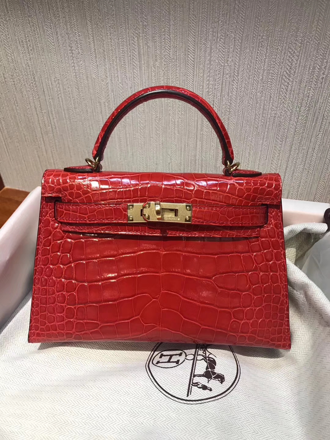 Brand: Hermes; Style: Minikelly-2 ; Material: Shiny Crocodile Leather;Color:CK95 Braise Red; Hardware: Gold; Size:19CM; Accessories: Padlock and keys, dust bag.Functions: Tote Bag, Clutch Bag,Evening Bag
