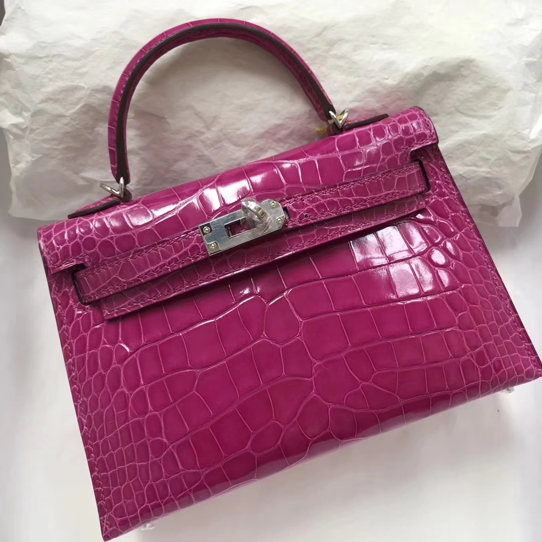Brand: Hermes; Style: Minikelly-2 ; Material: Alligator Shiny Crocodile Leather;Color:J5 Rose Scheherazade; Hardware: Silver; Size:19CM; Accessories: Padlock and keys, dust bag.Functions: Tote Bag, Clutch Bag,Evening Bag