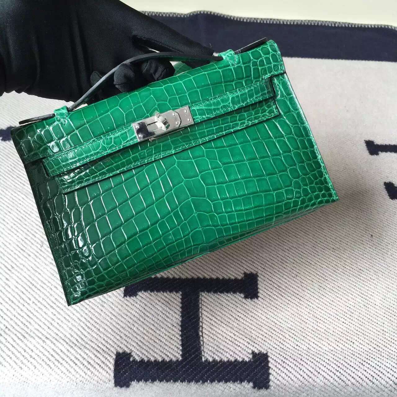 Brand: Hermes; Style: Minikelly pochette 22CM ; Material: Crocodile Shiny Leather;Color: 6Q Emerald Green; Hardware: silver/gold; Accessories: Padlock and keys, dust bag.Functions: tote bag, clutch bag.