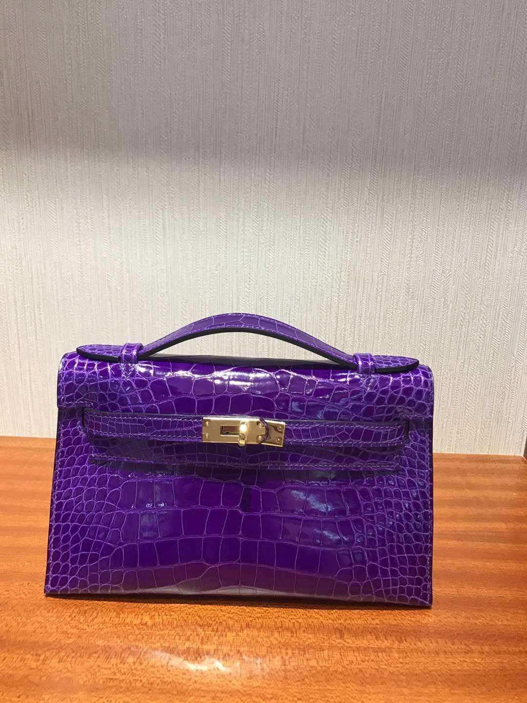 Brand: Hermes; Style: Minikelly Pochette 22CM ; Material: Alligator Shiny Crocodile Leather;Color:5L Ultraviolet; Hardware: Gold; Accessories: Padlock and Keys, Dust Bag.Functions: Tote Bag, Clutch Bag.