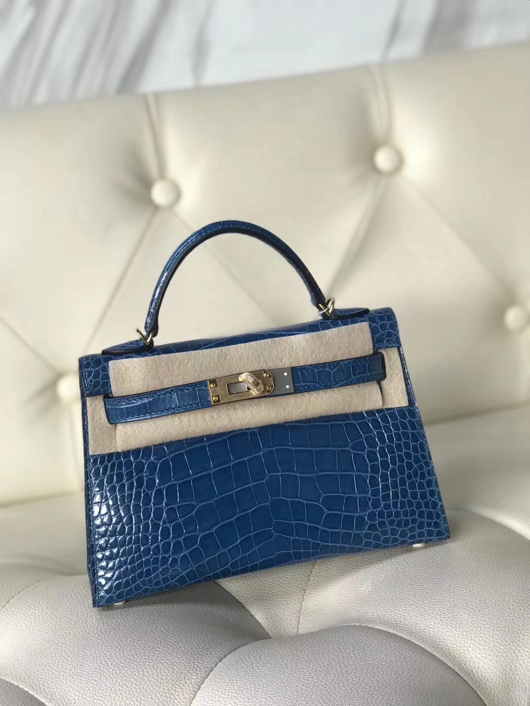 Brand: Hermes; Style: Minikelly-2 ; Material: Alligator Shiny Crocodile Leather;Color:7Q Mykonos Blue; Hardware: Gold; Size:19CM; Accessories: Padlock and keys, dust bag.Functions: Tote Bag, Clutch Bag,Evening Bag