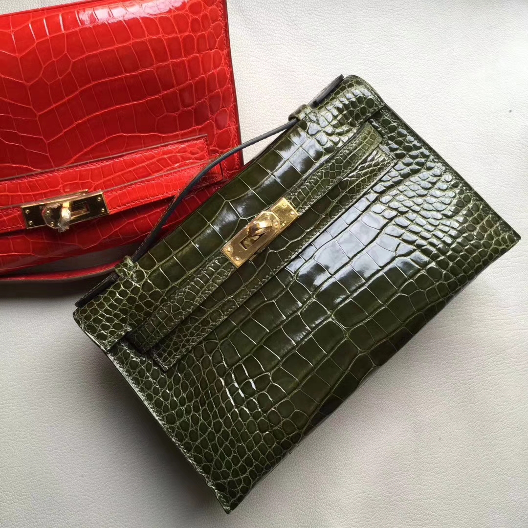 Brand: Hermes; Style: Minikelly Pochette 22CM ; Material: Crocodile Shiny Leather;Color: V6 Olive Green; Hardware: Gold; Accessories: Padlock and Keys, Dust Bag.Functions: Tote Bag, Clutch Bag.