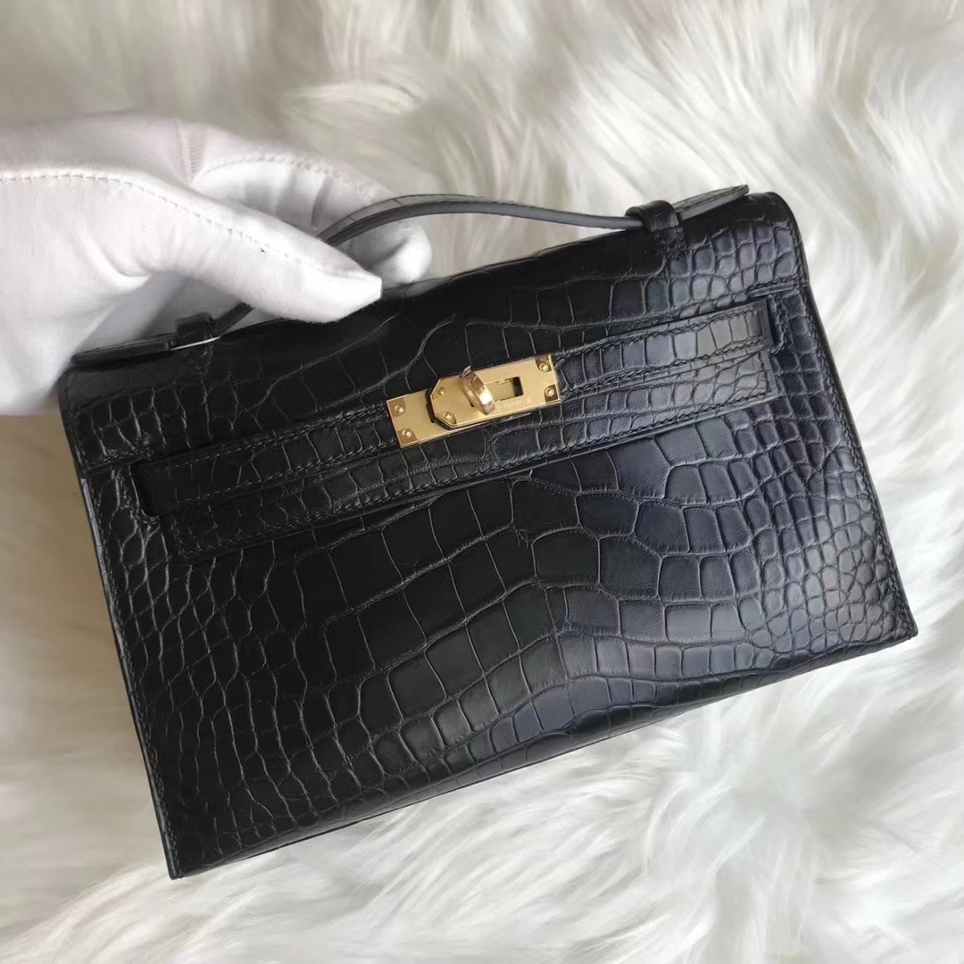 Brand: Hermes; Style: Minikelly Pochette 22CM ; Material:Alligator Matt Crocodile Leather;Color:CK89 Black; Hardware:Gold; Accessories: Padlock and Keys, Dust Bag.Functions: Tote Bag, Clutch Bag,Evening Bag.