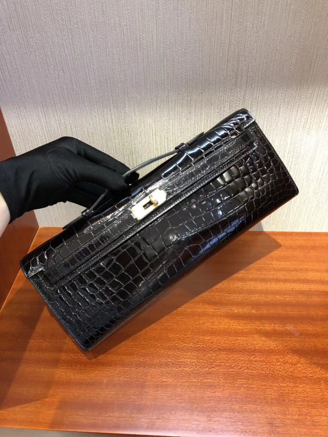 Brand: Hermes; Style: Kelly Cut; Material:Shiny Crocodile Leather;Color: CK89 Black; Size: 31CM; Hardware: Gold; Accessories: Padlock and Keys, Dust Bag.Functions: Clutch Bag,Evening Bag.
