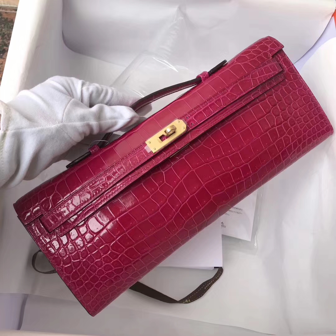 Brand: Hermes; Style: Kelly Cut; Material: Porosus Shiny Crocodile Leather;Color: J5 Rose Scheherazade; Size: 31CM; Hardware: Gold; Accessories: Padlock and Keys, Dust Bag.Functions: Clutch Bag,Evening Bag.