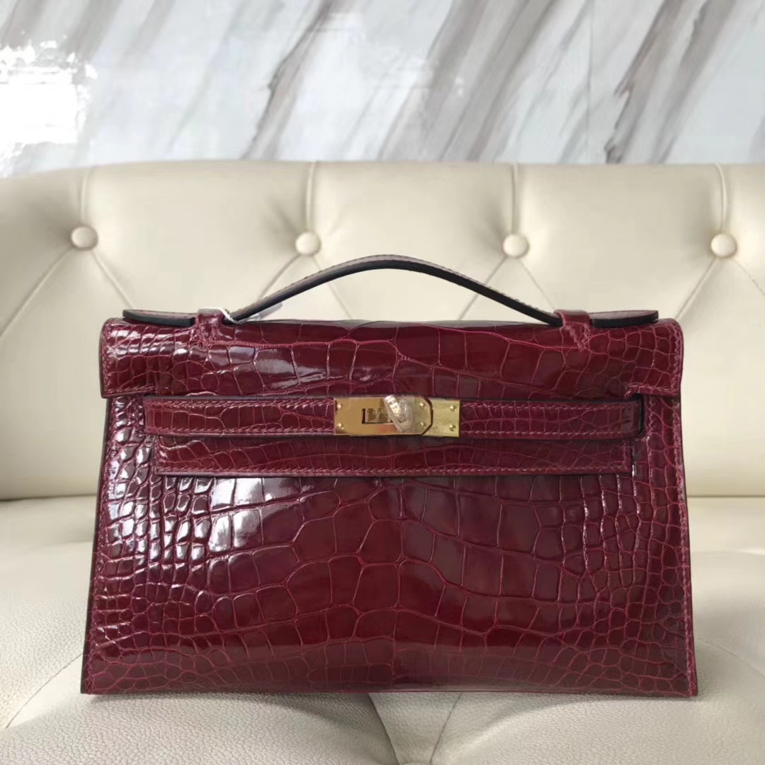 Brand: Hermes; Style: Minikelly Pochette 22CM ; Material:Alligator Shiny Crocodile Leather;Color:F5 Bourgogne Red; Hardware:Gold; Accessories: Padlock and Keys, Dust Bag.Functions: Tote Bag, Clutch Bag,Evening Bag.