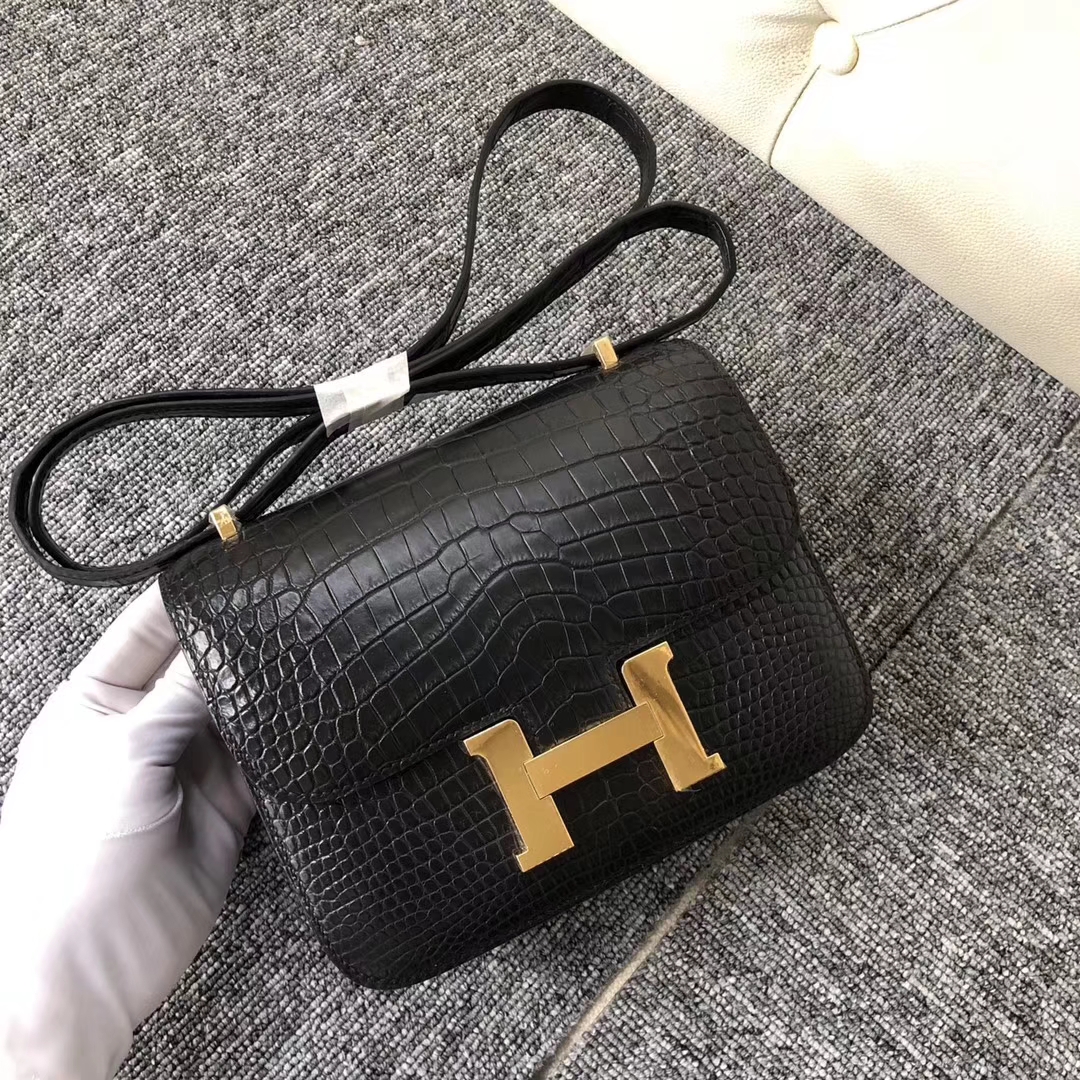Brand: Hermes; Style: Constance Bag; Material: Alligator Matt Crocodile Leather;Color:CK89 Noir; Size:18cm; Hardware:Gold; Package:Complete Package.Function:Shoulder Bag,Cross Body Bag.