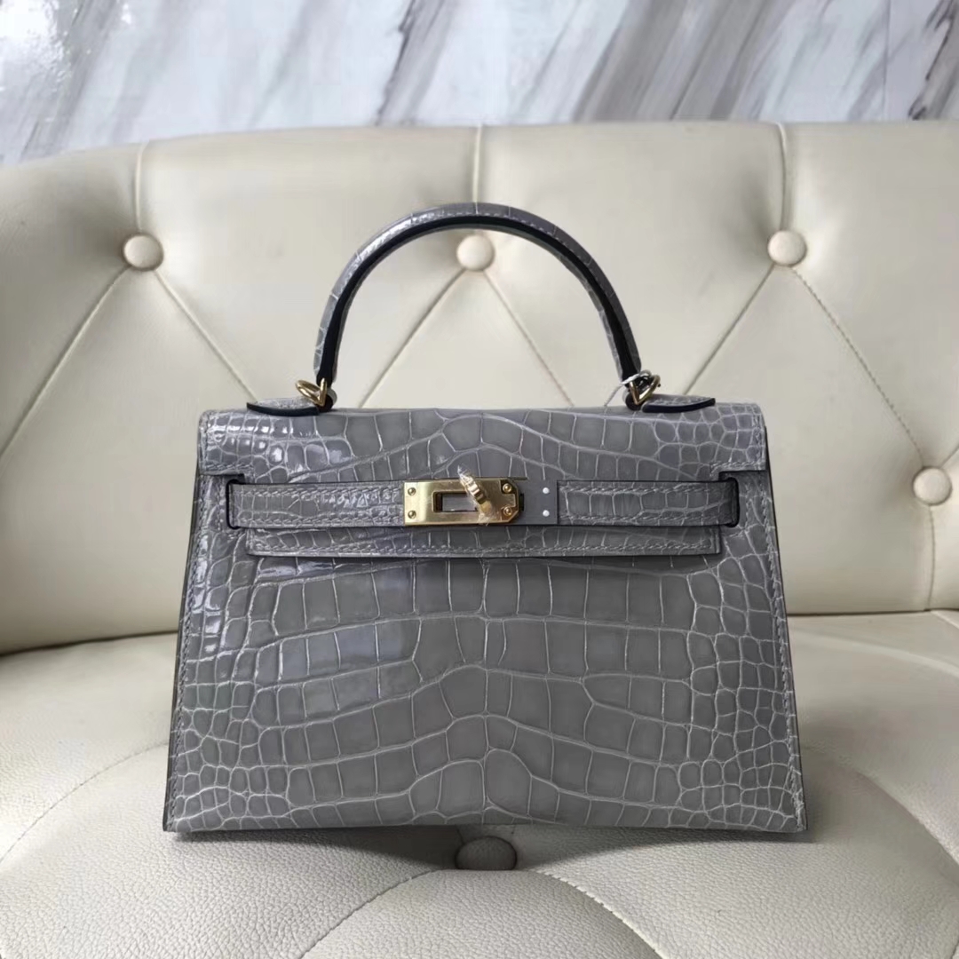 Brand: Hermes; Style: Minikelly-2 ; Material: Alligator Shiny Crocodile Leather;Color:Gris Paris; Hardware: Gold; Size:19CM; Accessories: Padlock and keys, dust bag.Functions: Tote Bag, Clutch Bag,Evening Bag