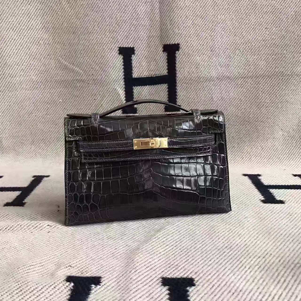 Brand: Hermes; Style: Minikelly pochette 22CM ; Material: Crocodile Shiny Leather;Color: 88 Graphite Grey; Hardware: silver/gold; Accessories: Padlock and keys, dust bag.Functions: tote bag, clutch bag.