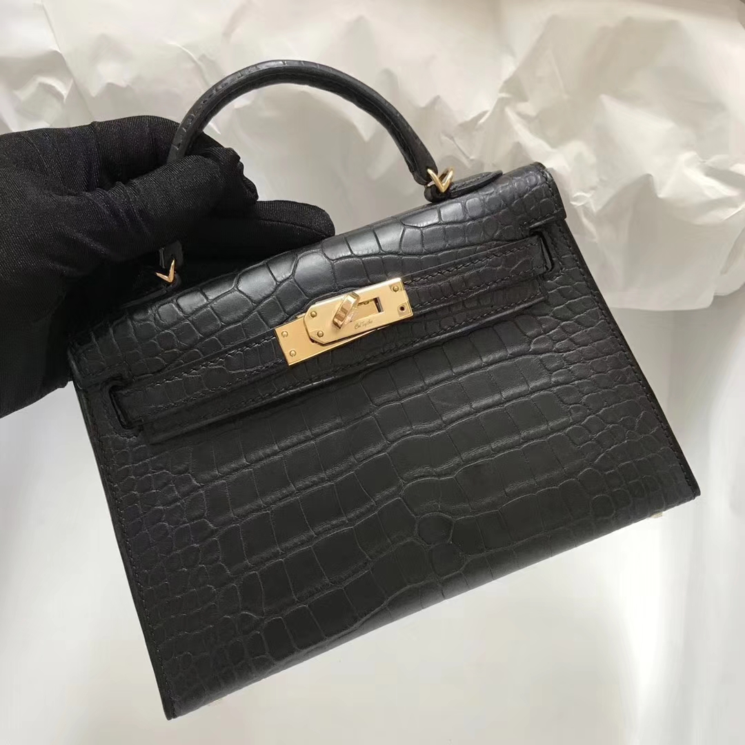 Brand: Hermes; Style: Minikelly-2 ; Material: Alligator Matt Crocodile Leather;Color:CK89 Black; Hardware: Gold; Size:19CM; Accessories: Padlock and keys, dust bag.Functions: Tote Bag, Clutch Bag,Evening Bag
