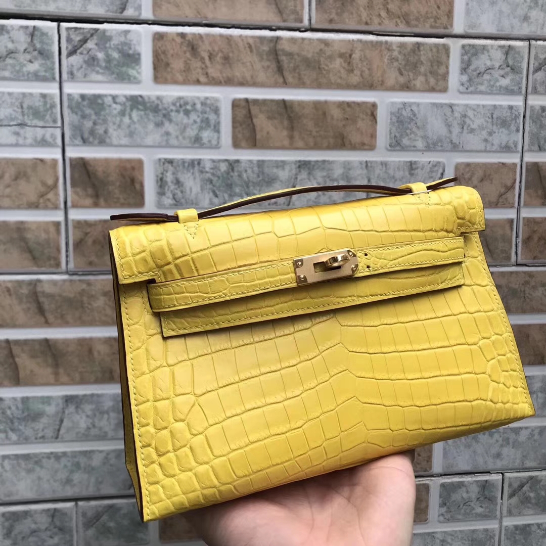 Brand: Hermes; Style: Minikelly Pochette 22CM ; Material:Crocodile Matt Leather;Color:9R Lemon Yellow; Hardware: Gold; Accessories: Padlock and Keys, Dust Bag.Functions: Tote Bag, Clutch Bag.