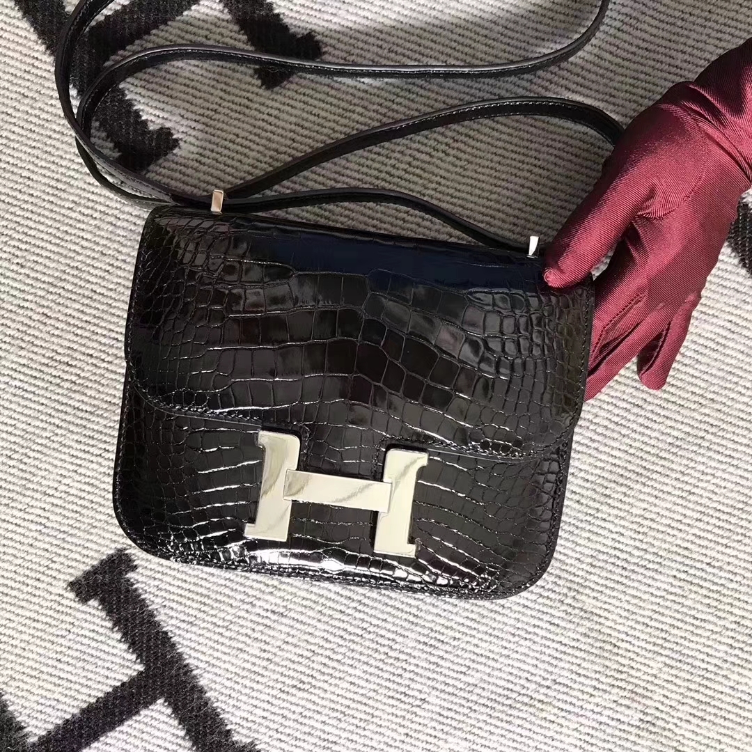 Brand: Hermes; Style: Constance Bag; Material: Shiny Crocodile Leather;Color:Black; Size:19cm;Hardware:Silver; Accessories: Dust Bag. Function:Shoulder Bag,Cross-body Bag.