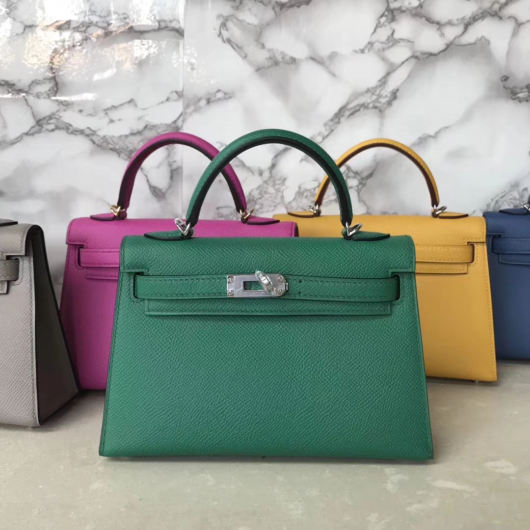 Brand: Hermes; Style: Minikelly-2 ; Material: Epsom Calf Leather;Color:U4 Vert Verigo; Hardware: Silver; Size:19CM; Accessories: Padlock and keys, dust bag.Functions: Tote Bag, Clutch Bag,Evening Bag