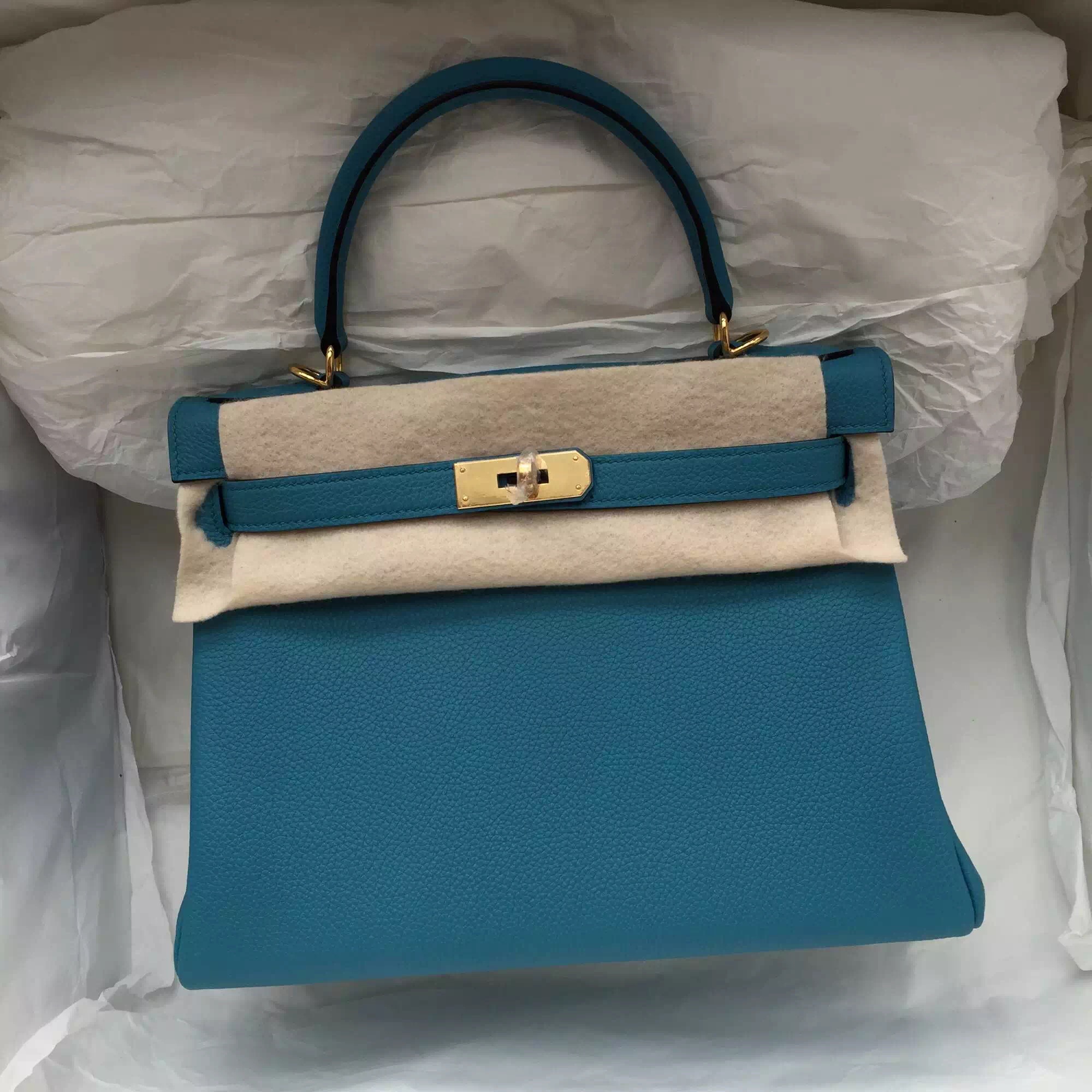 Brand: Hermes; Style: Kelly Bag; Material: togo leather;Color: 7B Turquoise Blue; Hardware: gold/silver; Accessories: Padlock and keys, dust bag.Function:tote bag.