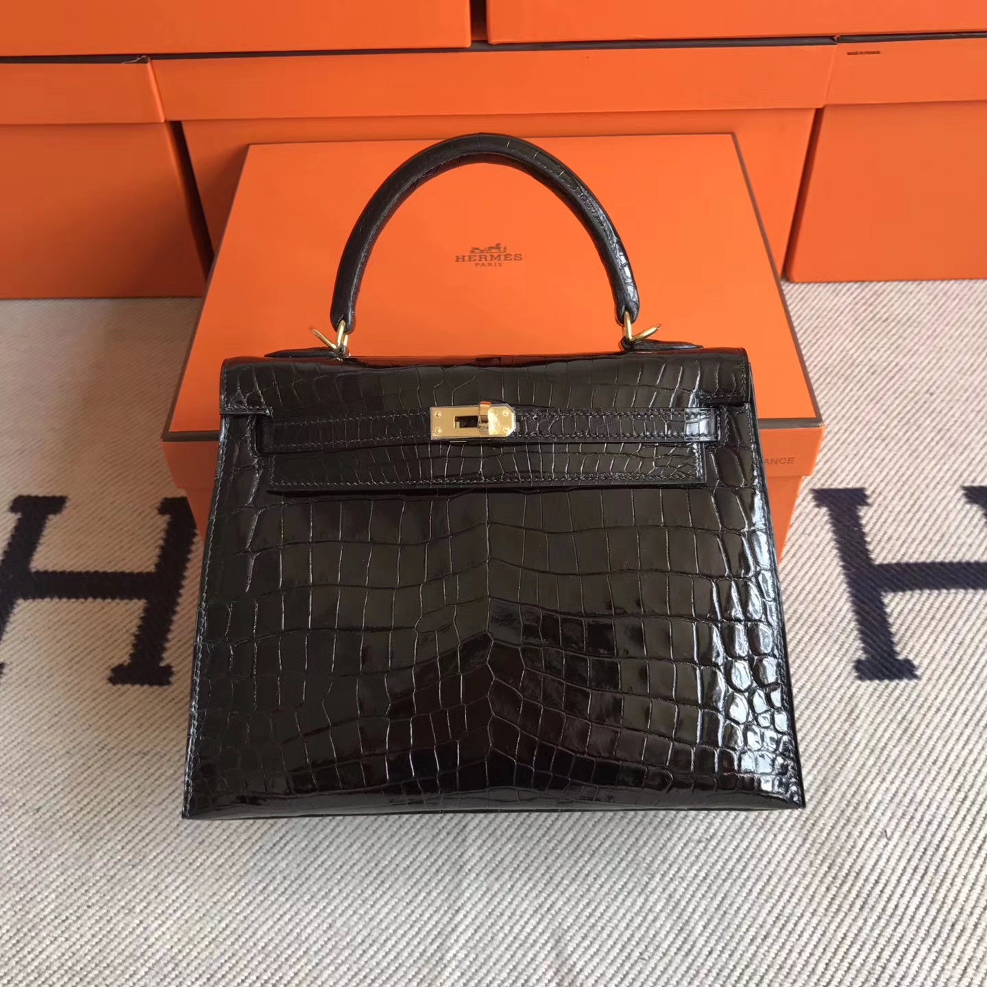 Brand: Hermes; Style: Sellier Kelly Bag; Material: Crocodile Shiny Leather; Color:CK89 Black ;Size:25cm; Hardware: Gold; Accessories: Padlock and keys, dust bag.Functions: tote bag,shoulder bag.