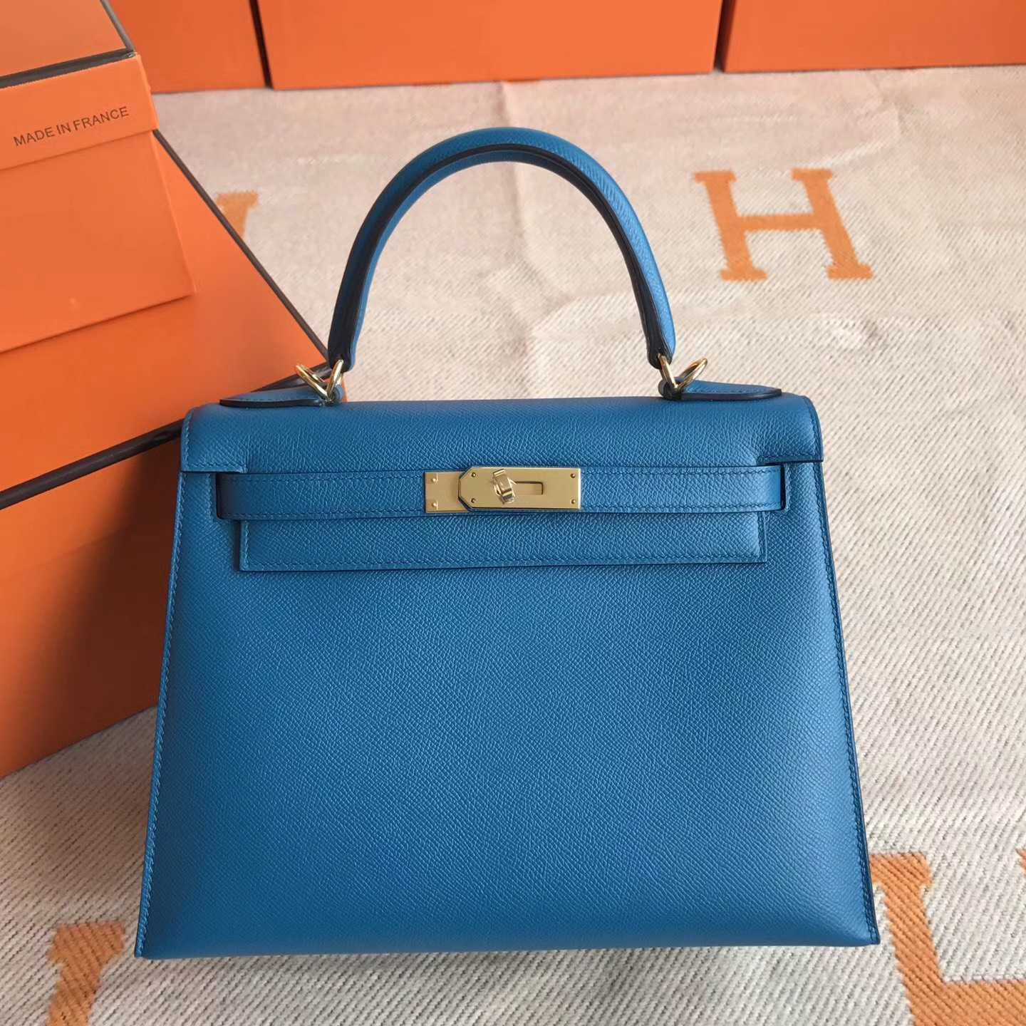 Brand: Hermes; Style: Sellier Kelly Bag; Material: Epsom Calfskin Leather; Color:7W Blue Izmir;Size:28cm; Hardware: Gold; Accessories: Padlock and Keys, Dust Bag.Functions: Tote Bag,Shoulder Bag.