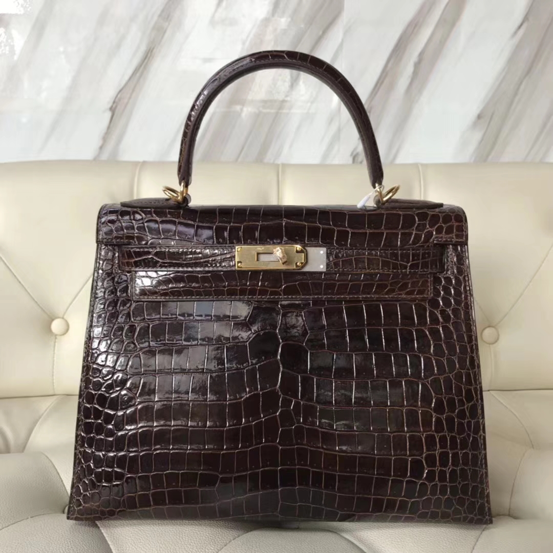 Hermes 4D Coffee Color Porosus Shiny Crocodile Kelly 28CM Bag Gold Hardware