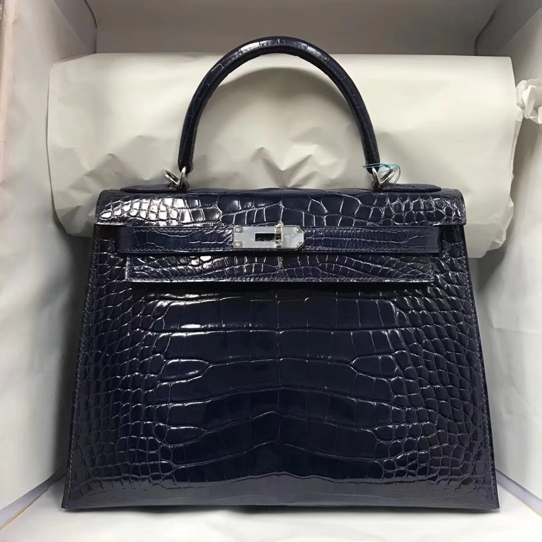 Brand: Hermes; Style: Sellier Kelly Bag; Material:Porosus Shiny Crocodile Leather; Color:73 Blue Saphir;Size:28cm; Hardware:Silver; Accessories: Padlock and Keys, Dust Bag.Functions: Tote Bag,Shoulder Bag.