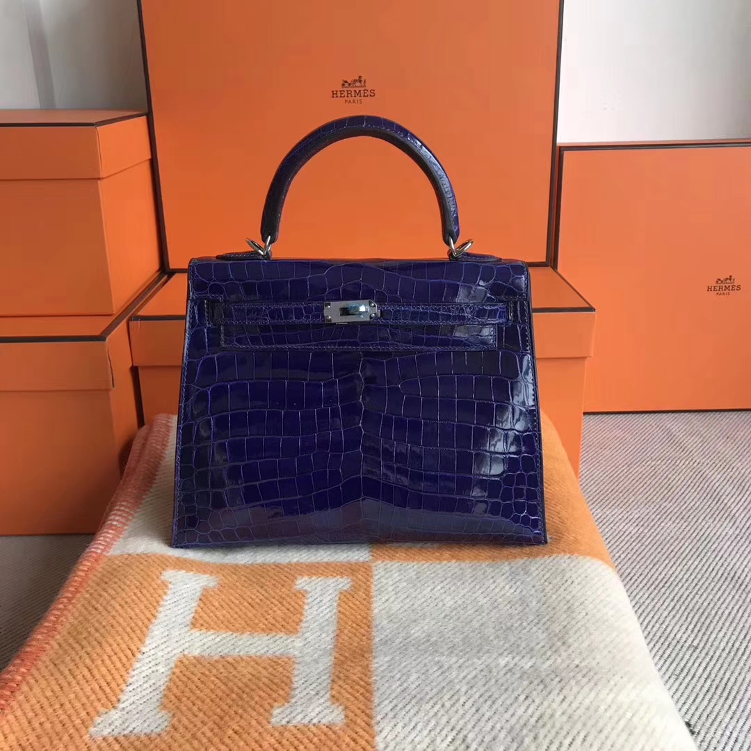 Brand: Hermes; Style: Sellier Kelly Bag; Material: Shiny Crocodile Leather; Color:7T Blue Electric;Size:25cm; Hardware: Silver; Accessories: Padlock and Keys, Dust Bag.Functions: Tote Bag,Shoulder Bag.