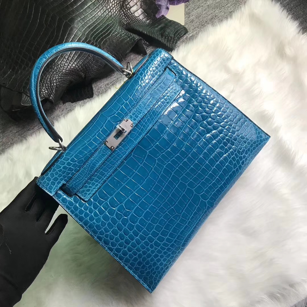 Brand: Hermes; Style: Sellier Kelly Bag; Material: Porosus Shiny Crocodile Leather; Color: 7W Blue Izmir;Size:28cm; Hardware: Silver; Accessories: Padlock and Keys, Dust Bag.Functions: Tote Bag,Shoulder Bag.