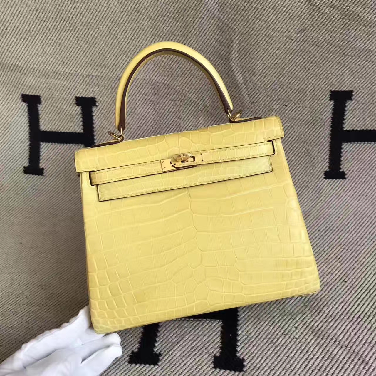 Hermes 9R Lemon Yellow Crocodile Matt Leather Kelly Bag 25CM
