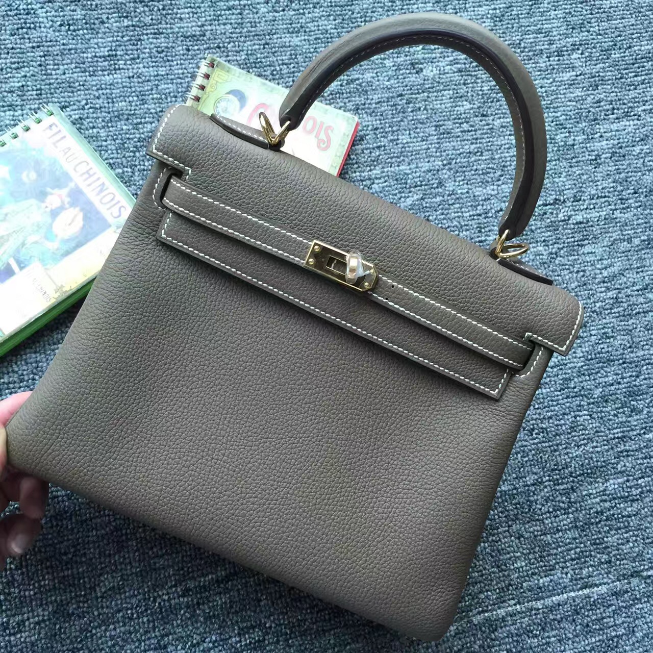 Brand: Hermes; Style: Retourne Kelly Bag25CM ; Material: Togo Calfskin Leather; Color: C81 Etoupe Grey; Hardware: gold/silver; Accessories: Padlock and keys, dust bag.Functions: tote bag,shoulder bag.