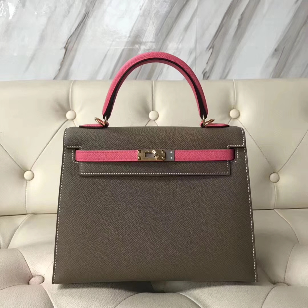 Brand: Hermes; Style: Sellier Kelly Bag; Material: Epsom Calf Leather; Color:CK18 Etoupe Grey/8W Rose Azalee;Size:25cm; Hardware:Gold; Accessories: Padlock and Keys, Dust Bag.Functions: Tote Bag,Shoulder Bag