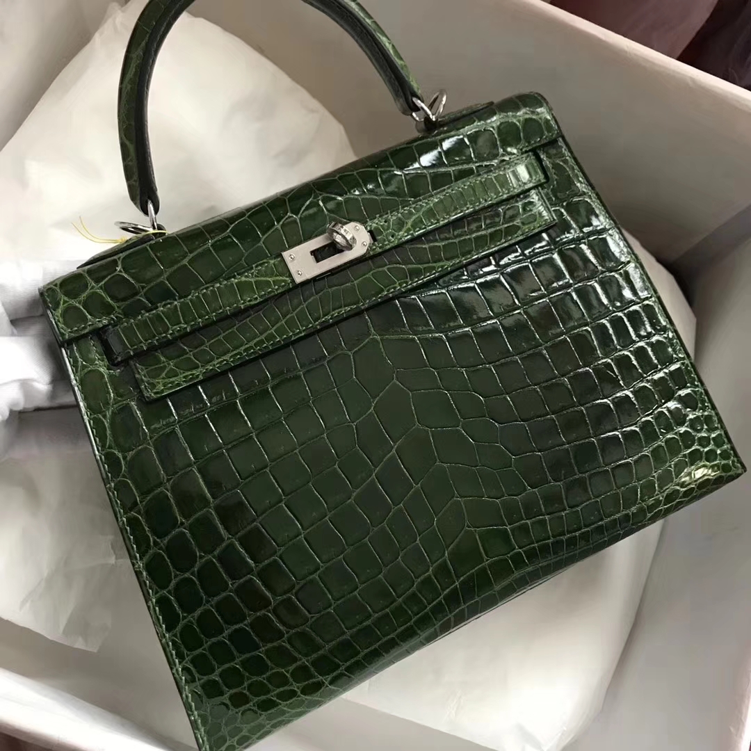 Hermes CK67 Vert Fonce Shiny Crocodile Kelly 25CM Bag Silver Hardware