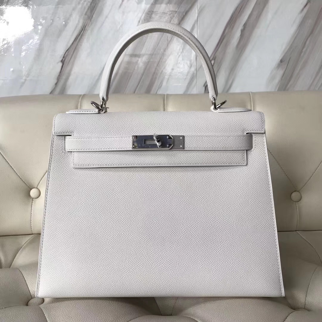 Brand: Hermes; Style: Sellier Kelly Bag; Material: Epsom Calf Leather; Color:01 White; Size:28cm; Hardware:Silver; Accessories: Padlock and Keys, Dust Bag.Functions: Tote Bag,Shoulder Bag