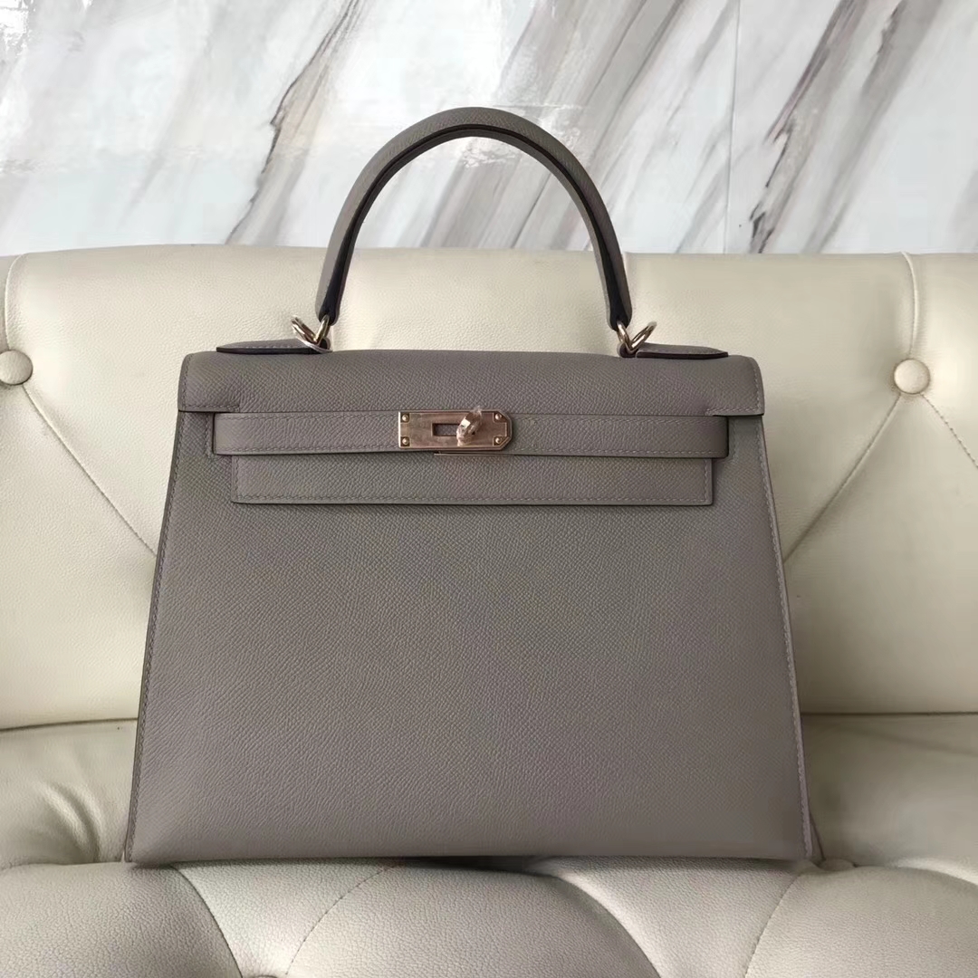 Brand: Hermes; Style: Sellier Kelly Bag; Material: Epsom Calf Leather; Color:M8 Gris Ashpite/Wine Red inner;Size:28cm; Hardware:Rose Gold; Accessories: Padlock and Keys, Dust Bag.Functions: Tote Bag,Shoulder Bag
