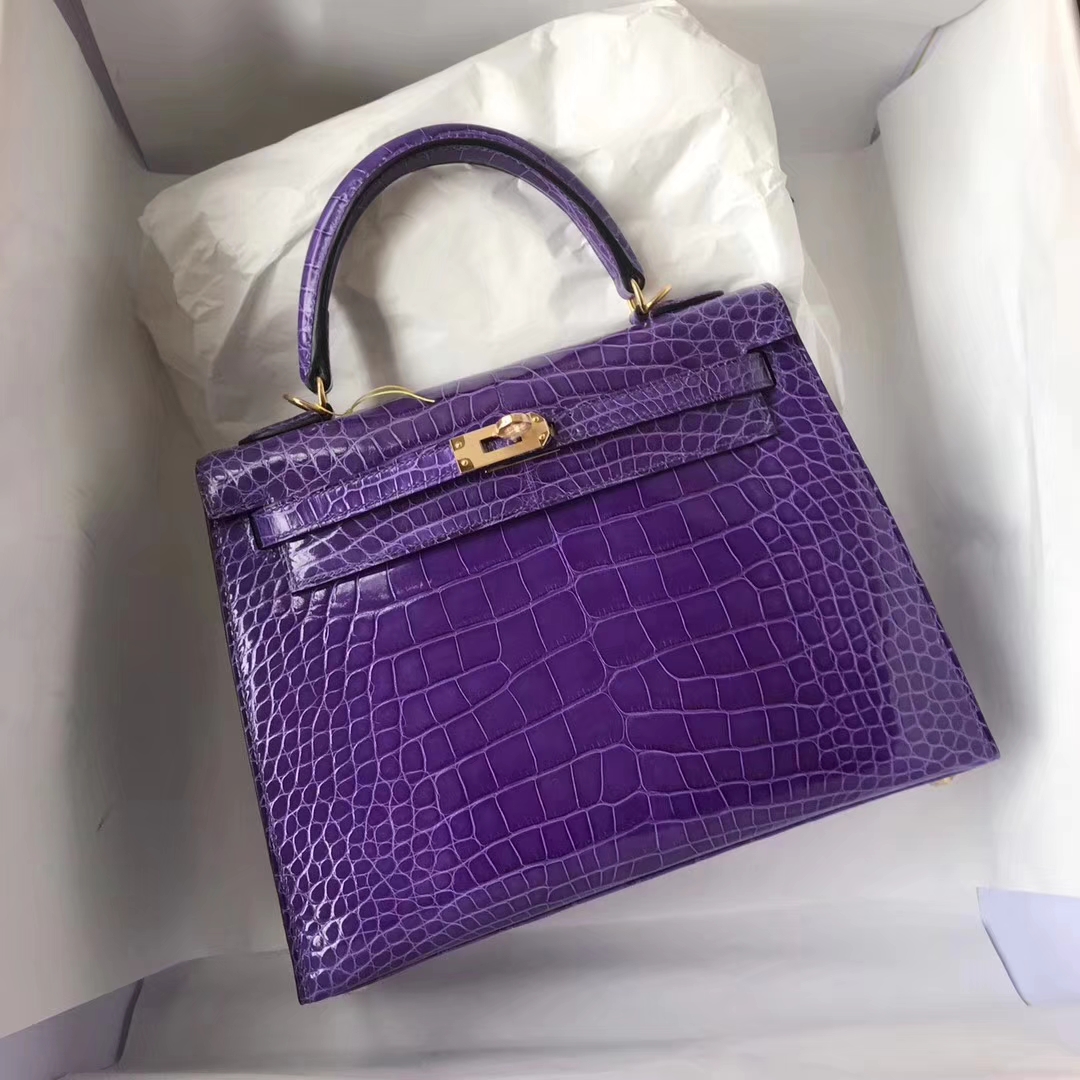Brand: Hermes; Style: Sellier Kelly Bag; Material: Alligator Shiny Crocodile Leather; Color:5L Ultraviolet;Size:25cm; Hardware: Gold; Accessories: Padlock and Keys, Dust Bag.Functions: Tote Bag,Shoulder Bag.