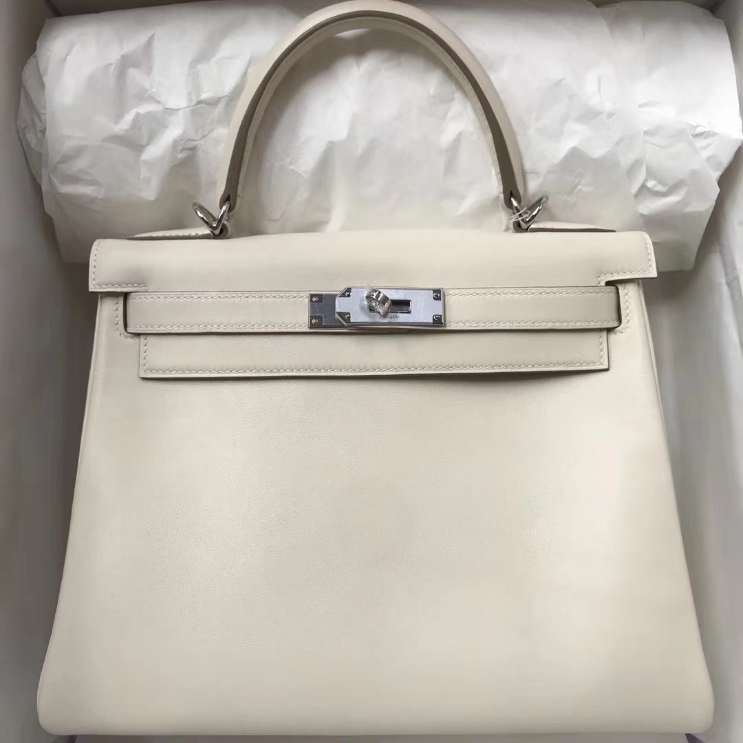 Brand: Hermes; Style: Retourne Kelly Bag; Material: Swift Calf Leather; Color: CK10 Craie; Size:28cm; Hardware: Silver; Accessories: Padlock and keys, dust bag.Functions: tote bag,shoulder bag.