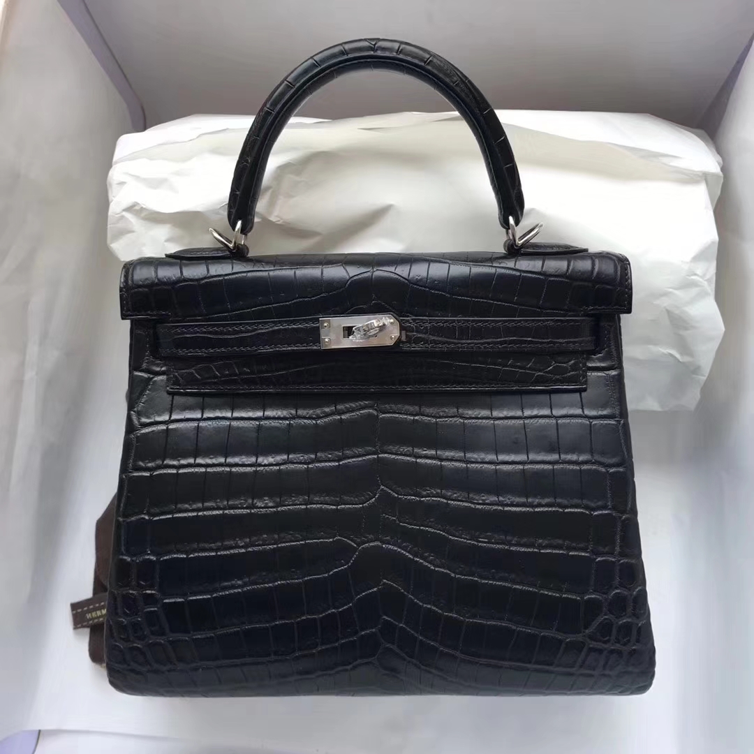 Elegant Hermes Crocodile Matt Kelly25CM Bag in CK89 Black Silver Hardware Elegant Hermes Crocodile Matt Kelly25CM Bag in CK89 Black Silver Hardware