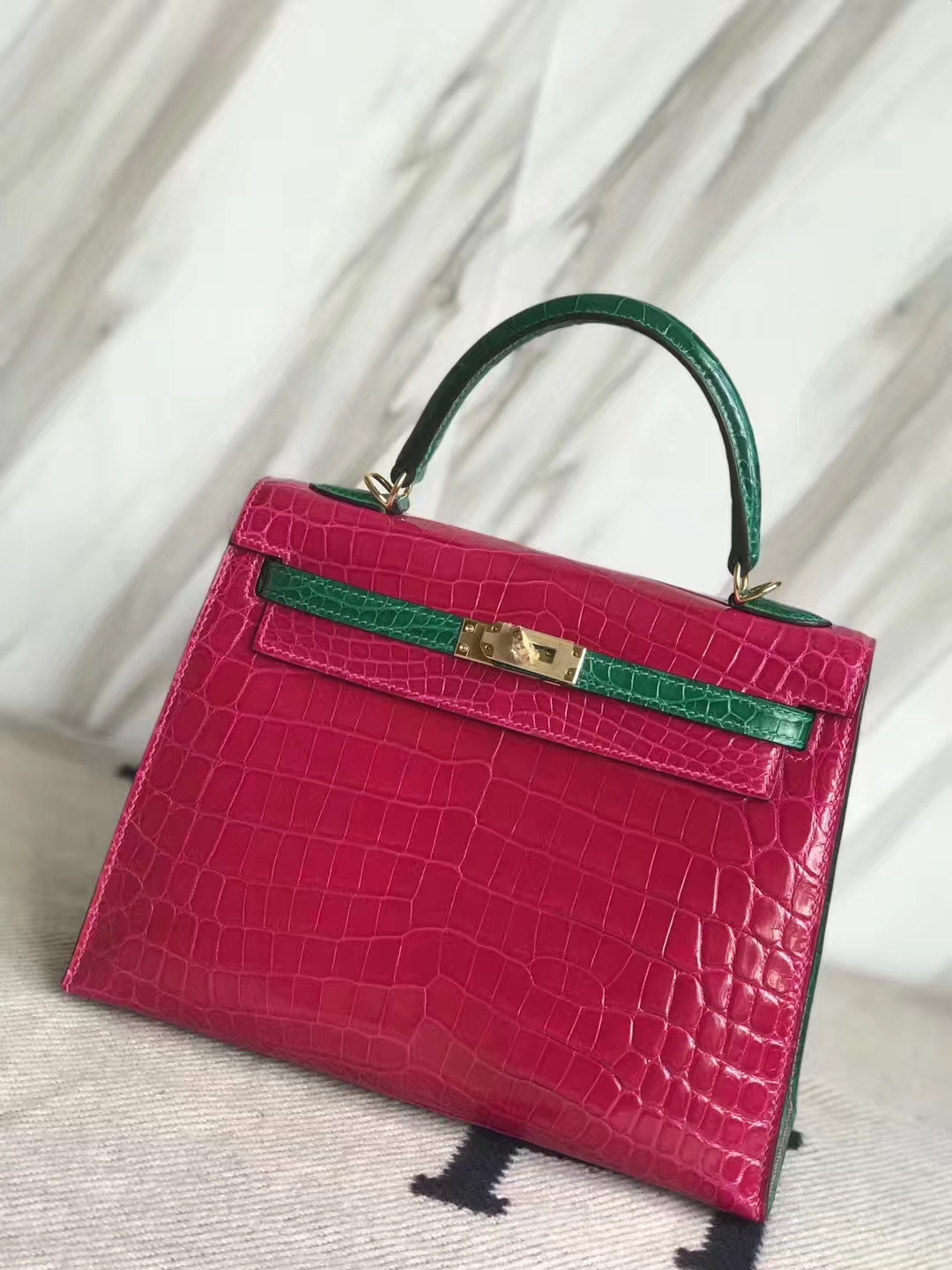 Brand: Hermes; Style: Sellier Kelly Bag; Material: Shiny Crocodile Leather; Color:J5 Rose Scheherazade/6Q Emerald Green;Size:25cm; Hardware:Gold; Accessories: Padlock and Keys, Dust Bag.Functions: Tote Bag,Shoulder Bag.