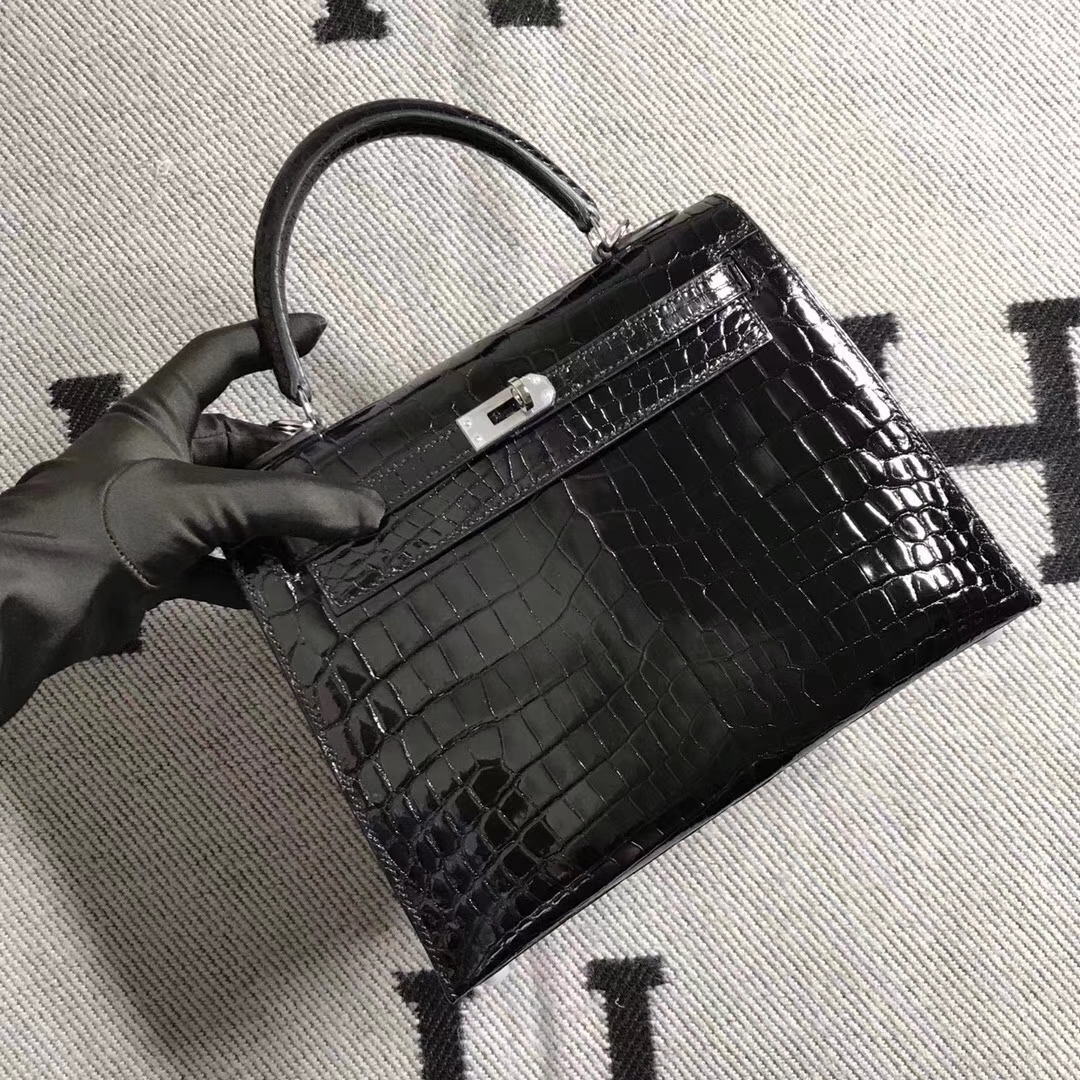 Brand: Hermes; Style: Sellier Kelly Bag; Material: Shiny Crocodile Leather; Color:CK89 Black; Size:25cm; Hardware:Silver; Accessories: Padlock and Keys, Dust Bag.Functions: Tote Bag,Shoulder Bag